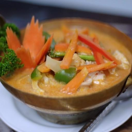 Thai red curry with coconut milk, bamboo shoots and fresh vegetables.